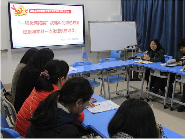 为落实创新党支部教育活动,强化党支部的核心堡垒作用和党员的先锋模范作用。近日,信息工程学院各教工党支部,以“‘一强化两拓展’发展战略中的特色专业建设与学科一体化建设”为主题,开展主题党日活动,全体教工党员参加此次活动。