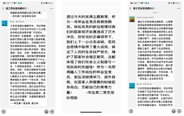 活动结束后,学生党员在微信群里纷纷发言,对本次学习内容展开热烈讨论。他们表示,作为一名党员,我们要牢记总书记的重要指示精神,树立崇高的理想信念,勇于担当历史责任,扎实学好专业知识,充分发挥青年学生党员的先锋模范作用,为国家贡献自己的力量。
