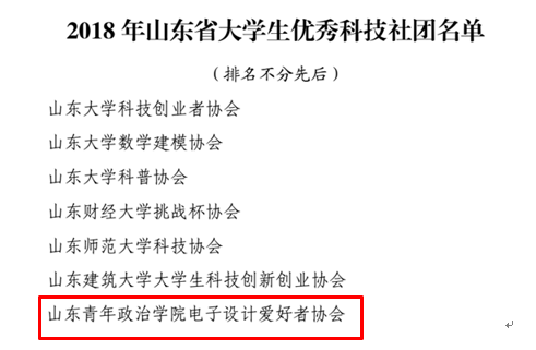 6月19日,山东省教育厅、山东省科学技术协会、共青团山东省委员会、省发改委等部门联合下发了《关于公布2018年山东省大学生优秀科技社团和优秀科技社团干部评选结果的通报》,我校电子设计爱好者协会荣获“山东省优秀大学生科技社团”称号,电子信息工程专业孙新和信息管理与信息系统专业朱玉帅荣获“山东省优秀大学生科技社团干部”荣誉称号。