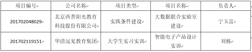 日前,教育部高等教育司正式公布了有关企业支持的2017年第二批产学合作协同育人项目立项名单,学院院长宁玉富教授主持的大数据联合实验室建设项目获北京西普阳光教育科技股份有限公司支持、刘栋老师主持的大学生实习实训项目获华清远见教育集团支持。这是我院第二次获得教育部产学合作协同育人项目立项。