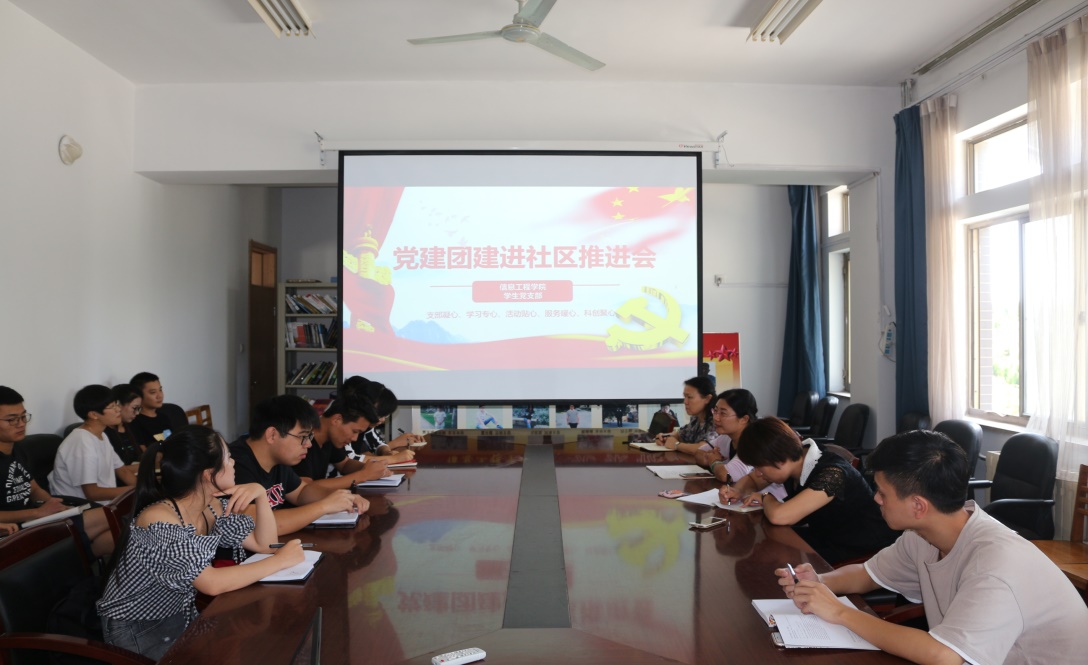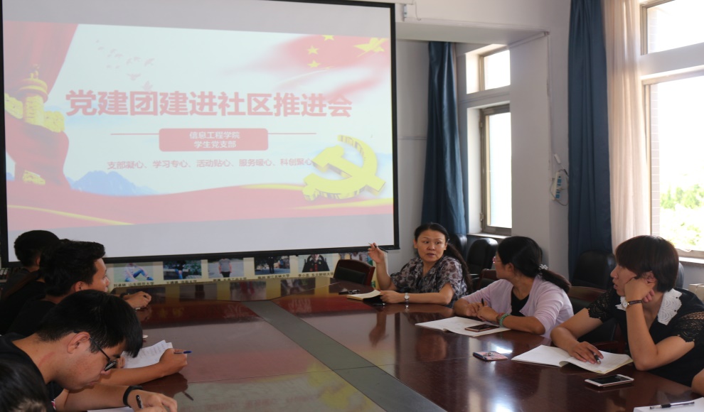 为发挥学生党员和学团干部在学生社区建设中的先锋模范作用,信息工程学院于2017年9月19日在D309召开“党建团建进社区”工作推进会,信息工程学院党总支副书记李朝晖、团总支书记张婷婷以及辅导员曲蓉蓉参加了此次会议。