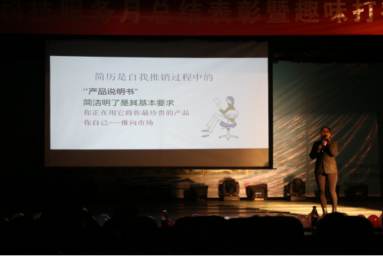 在科技服务月闭幕式上,张程带领大家通过PPT的形式,对简历大赛进行了回顾,并讲解了如何制作一份精美的求职简历。她认为,简历是自我推销过程中的“产品说明书”,简洁明了是其基本要求,投递简历要能吸引人的眼球,要明确简历的基本架构与要素简历,简历的内容在精而不在于全,并对制作简历要注意的问题和常出现的错误进行了重点讲解。如,求职简历要精简,清晰,没有错别字;注意简历的细节,如排版,字体颜色等。