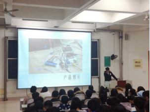 马骏向同学们展示了科技竞赛时的参赛作品,并简述制作流程及产品内在思想,鼓励大家学以致用、敢于创新,在科技风靡时代找寻存在价值;边珍珠讲述了电子信息技术应用大赛的有关知识,她强调团队协作的必要性和实践作品的重要性。