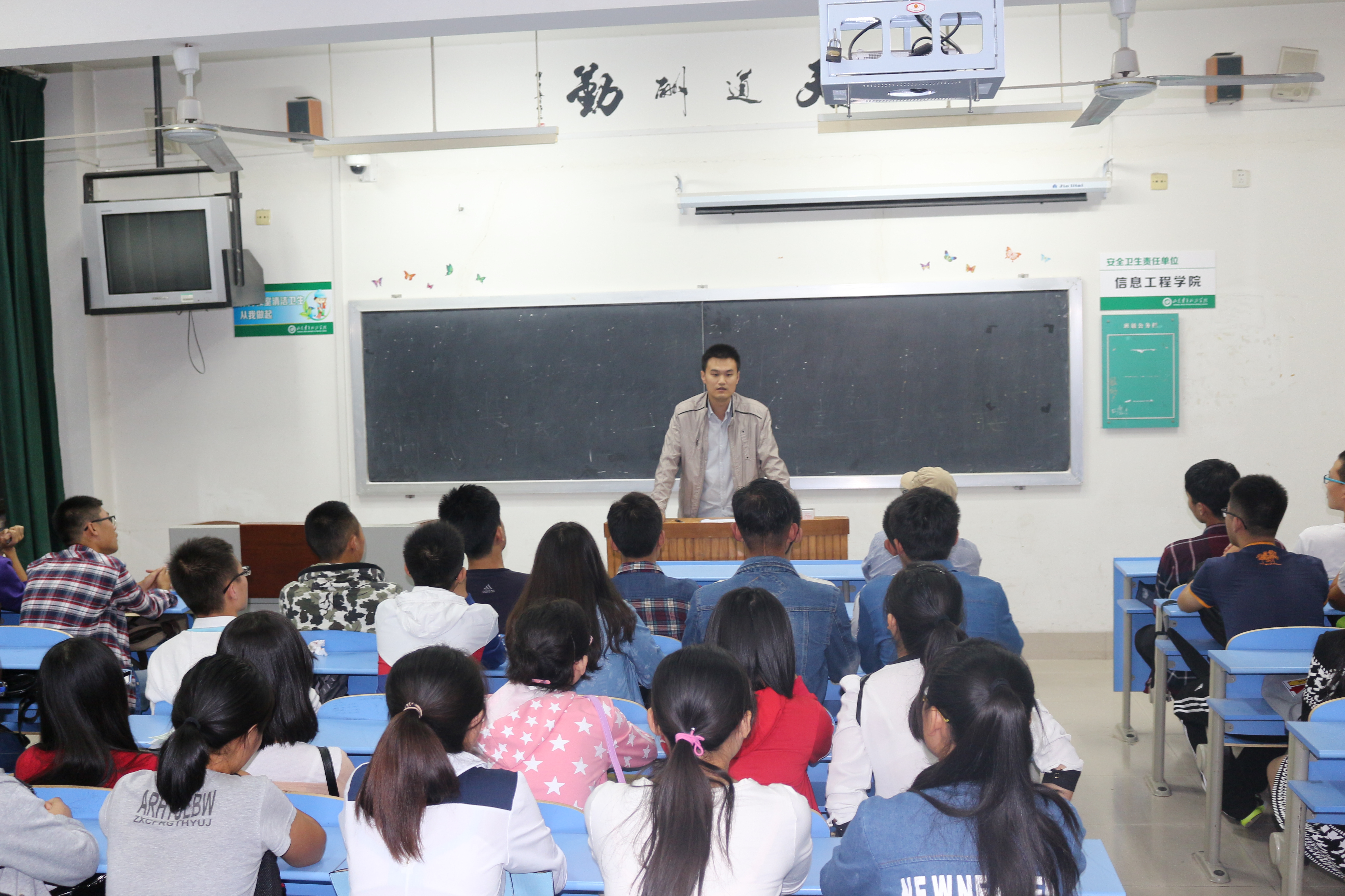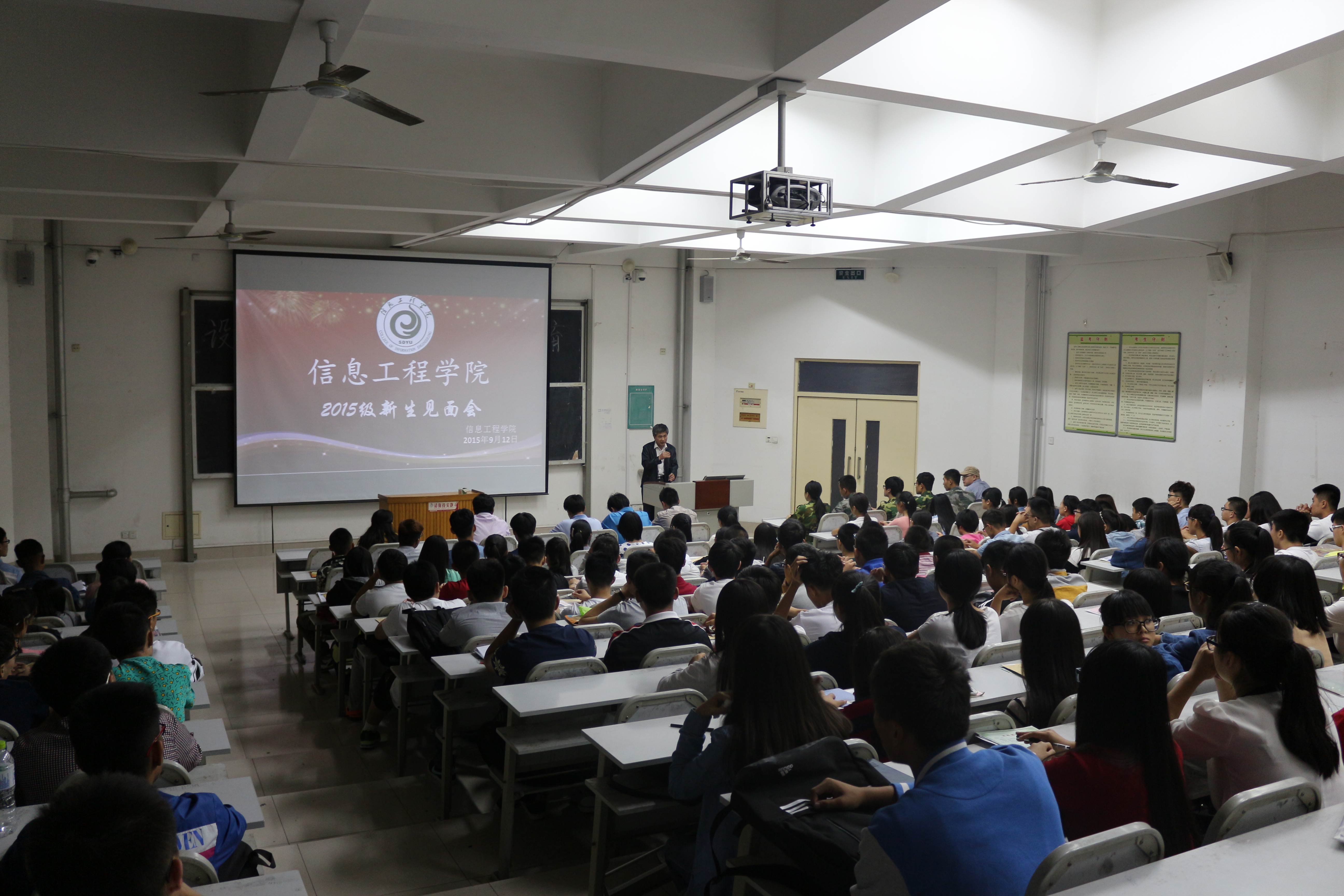 9月12日,信息工程学院召开2015级新生见面会,信息工程学院院长宁玉富,党总支书记王龙波,党总支副书记李朝晖,全体辅导员、新生班主任及2015级全体新同学参加了见面会。会议由牛传允老师主持。