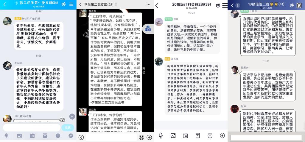 信息工程学院学生党员和各班级展开主题党日活动和主题团日活动,通过录制视频,围绕“五四精神、传承有我”展开讨论,抒发对五四精神的理解,积极学习、传递五四精神的内核。