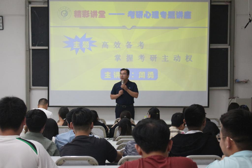 周勇老师从解读影响考研的各种因素入题,向同学们详细解析了具备考研良好心态和掌握科学备考方法的重要性。他强调,在心态方面“想的多”,就容易“做得少”,只有放松心态,甩下压力,拥有良好从容地心理素质,才能心无杂念,高效有序的进行复习工作。在学习方法方面,周勇老师向同学们讲解了“脑容量”的概念,他指出,我们的大脑有固定容量,想要高效获取海量信息,同学们应该摒除杂念,有计划、善规格地输入各种知识。最后,周勇老师与同学们进行了现场互动,认真解答了同学们的问题。考生们积极参与,现场气氛热烈反响强烈。周勇老师开门见山的讲述风格、条例清晰的讲述内容,舒缓了考研同学的压力,加深了学生对考研的理解,赢得了同学们阵阵热烈的掌声。