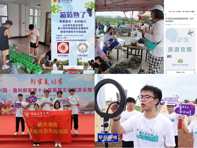 在“三下乡”中挥洒汗水,展现青春担当,助力乡村振兴。实践团走进田间地头,实地走访农户,了解到近年来郝家镇聚焦特色发展,致力于打造东营人自己的“果盘子”、菜篮子”,郝家镇已形成薛家葡萄、耿家蔬菜、黄店杂粮等特色产业,西郊高品质果蔬基地规模初显。当地政府工作人员告诉实践团成员,暑期正值葡萄收获季,但产品缺乏宣传,大量还是靠线下售卖。实践团成员结合自身所学给出了两条妙方: 一是以葡萄节为契机,通过微信公众号推广郝家镇旅游公略,着重宣传葡萄采摘园。二是通过电商销售、直播带货及同城配送等方法增大葡萄的销售量。为此,实践团成员注册营业执照,利用专业技术开发“薪火相传助农平台”,帮助农户拓宽销售渠道。由于在葡萄成熟期人手短缺,原本实践结束回家的实践团成员们,自告奋勇的再次来到薛家村葡萄园,帮助当地采摘、打包、配送,用实际行动贡献青春力量和智慧,助力乡村振兴。