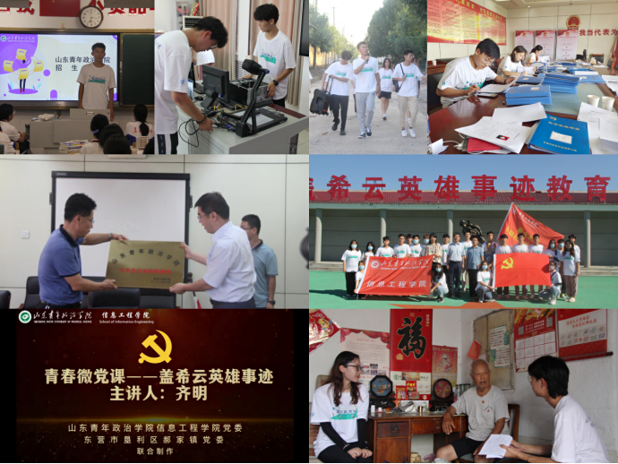 在“三下乡”中躬耕实践,展现青年形象,传承红色基因。连日来,薪火相传实践团队,依托“三下乡”活动,与郝家镇党委达成校地党建共建相关事宜,挂牌“山东青年政治学院大学生社会实践基地”。实践团队成员在郝家镇党委成员的带领下,探寻拜访了村落中的“党员之家”、“光荣之家”家庭,聆听老党员忆峥嵘岁月,赴“爆破大王”盖希云英雄精神教育基地,学习革命先烈的英雄事迹,并以“人民英雄”盖希云的英雄事迹为题材,录制微党课。在镇政府的支持下,团队成员赴垦利一中开展招生宣讲,参与筹备郝家镇“喜迎党的二十大,庆祝建党101周年”活动,赴镇政府扶困助农办帮助工作。团队学生党员走进郝家镇薛家村进行党史宣讲,将自己学习到的理论转化为“接地气”的语言,把红色历史故事、深刻理论讲鲜活,让党史学习教育贴近群众。实践团技术服务成员在薛家村开展“电脑义诊”志愿服务,帮村民优化系统和软件系统的更新升级等,将专业知识转化为服务社会的实践能力,让党史学习教育深入群众。