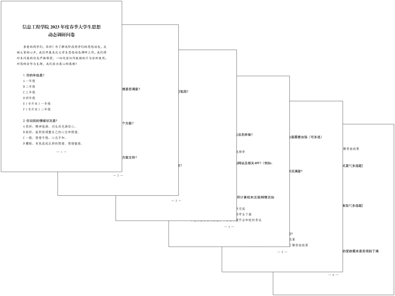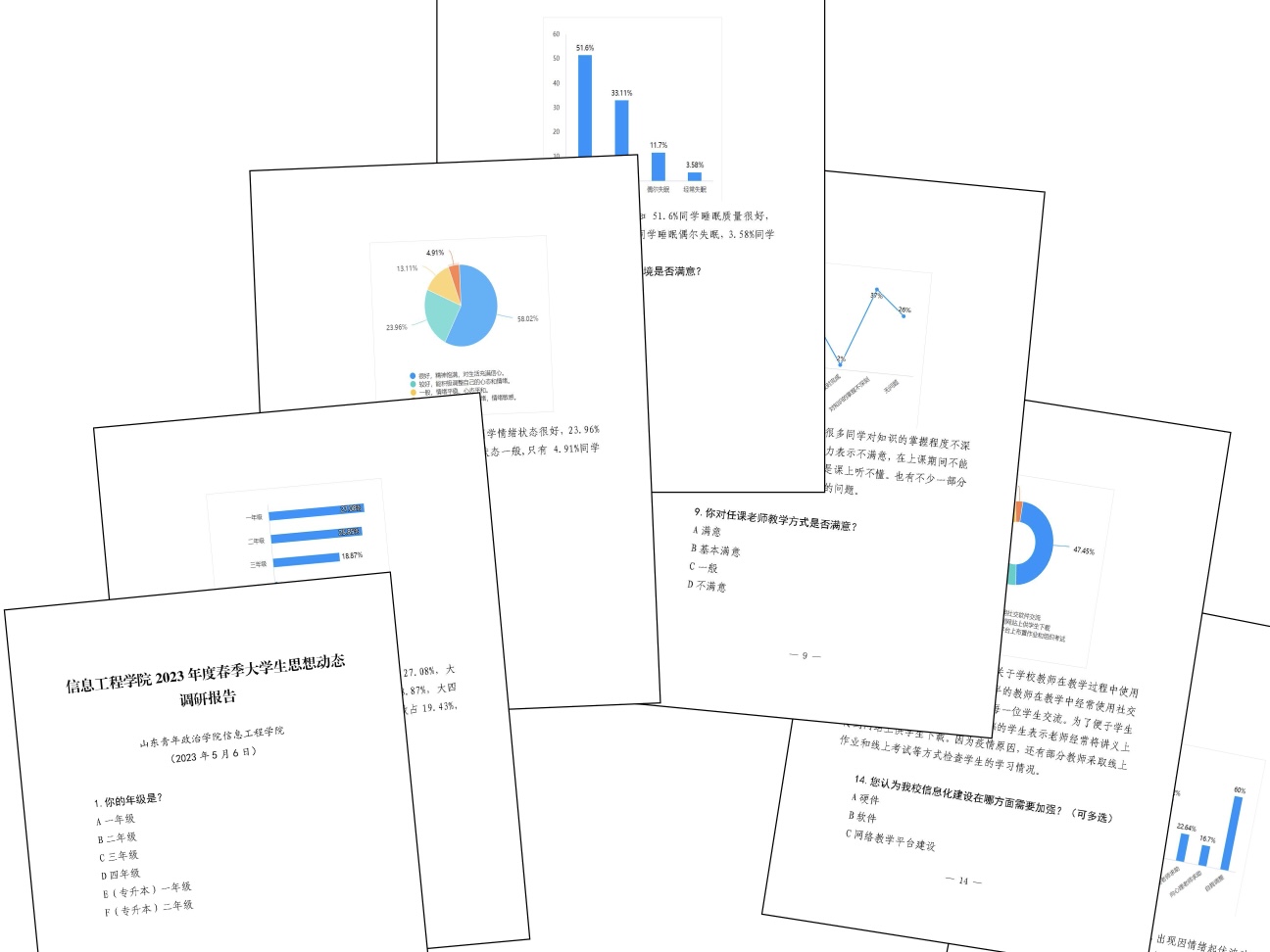 信息工程学院结合学生工作实际,聚焦学生所思所想,为进一步提升育人工作找准方向,精心设计《信息工程学院2023年度春季大学生思想动态调研问卷》。内容设计覆盖课程学习、学风建设、心理状态、职业规划、就业择业、资助帮扶、日常生活等各方面。对象选择覆盖全年级,面向学院全体学生发放调研问卷,系统、客观地获取学生思想状况的基础数据和现实状况。通过对调查问卷进行逐项统计、归纳、分析,形成《信息工程学院2023年度春季大学生思想动态调研报告》,充分了解到学生思想动态,力求做到“剖析典型、把握规律、以点带面”,为后期更加科学开展学生思想政治教育和学生教育管理提供决策依据和工作参考。