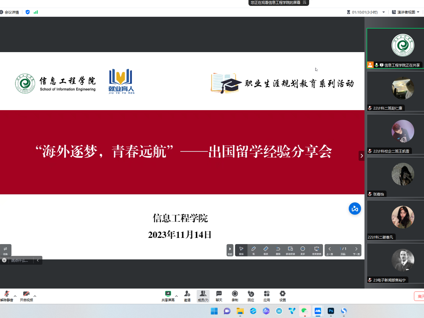 为做好做细大学生职业生涯规划和学业指导工作,满足学生留学咨询需求,帮助学生明晰出国留学政策和留学相关事宜,进一步教育引导我院学子开拓视野眼界、丰富发展渠道、夯实就业基础,11月14日,信息工程学院开展2023年出国留学经验专题分享会。学院辅导员刘可寒,2022届优秀毕业生、现英国埃克塞特大学在读生张君仁主讲。活动通过线上线下相结合的形式开展。