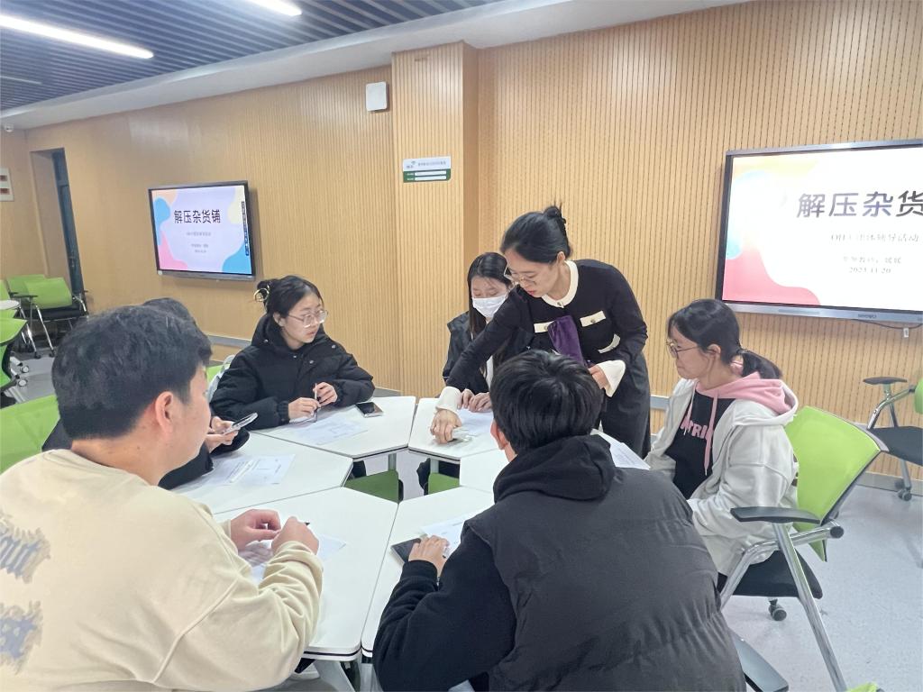 让考研人轻装上阵是学生工作中的重中之重。学院特邀校心理咨询中心教师牛媛媛为考研学生进行“解压杂货铺”考研心理减压团体辅导。她带领学生通过压力识别机看见自我的压力所在,利用压力探测仪发现自我潜意识层面的压力源,在随机抽取解压能量包的环节里引导学生打破自身内在的限制性信念,帮助学生释放情绪压力,提高情绪调节能力,提升学习效率和自信心。