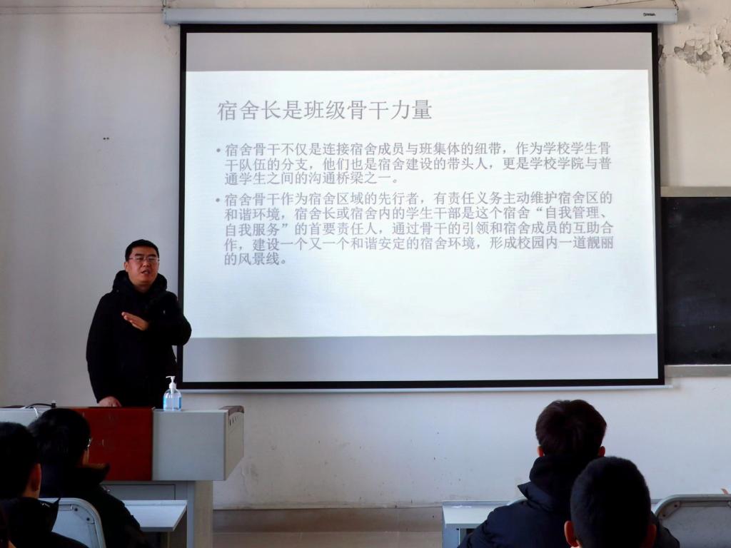 马骋以“基于学生发展视角的学生骨干培养阐释-学生宿舍骨干培养”为主题,围绕“宿舍长是班级骨干力量”“宿舍骨干队伍建设存在的问题”“下一步改进措施”三大模块,通过理论阐述和案例呈现相结合形式面向与会人员展开深入浅出的讲解。他指出,宿舍是大家日常生活学习的主要场所和关键场域,在个人和集体成长发展过程中的地位日益凸显。宿舍长既是班级学生骨干的重要组成部分,又是学校学生活动的主要组织者和参与者,更是学校各项学生工作顺利开展的关键队伍,有义务、责任大、担子重。他提出两点要求。一是要深化思想认识,担好责尽好职。宿舍长是宿舍事务管理的先行者和主力军,要第一时间传达好学校学院关于做好校园安全、学生安全、社区管理工作相关的最新会议精神和通知要求,要带好头、做表率。要深刻认识到宿舍是“点”,班级是“面”,各宿舍要齐心同向,力争形成“由点及面”逐步推进、循序渐进的发展趋势和良好态势。二是要强化宿舍建设,推进文化浸润。各宿舍要严格守好安全底线,在保证宿舍安全卫生的基础上注重进一步强化寝室整体文化建设。要深刻认识到宿舍对于个人成长、团队发展和集体进步的价值意义和重要功能。要注重舍风学风的持续培养和文化建设的“点滴积累”,力争“量变引起质变”,多打造出一批先锋宿舍、模范宿舍、标兵宿舍,用实际行动贯彻“文化润校”发展理念。