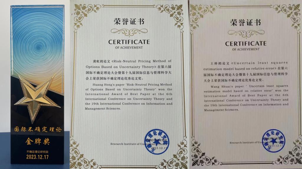 近日,在第六届国际不确定理论大会(ICUT)暨第十九届国际信息与管理科学大会(IMS)上,信息工程学院教师黄虹获得国际不确定理论金牌奖,黄虹的论文《Risk Neutral Pricing Method of Options Based on Uncertainty Theory》和王帅的论文《Uncertain Least Squares Estimation Model Based on Relative Error》获得国际不确定理论优秀论文奖。