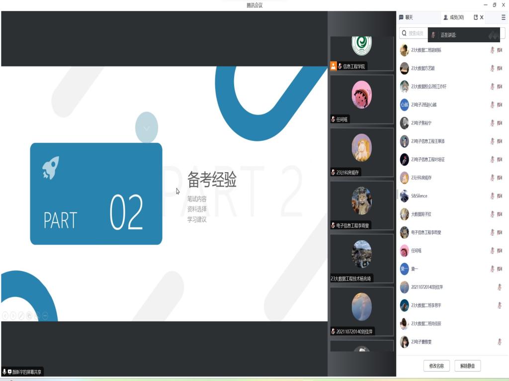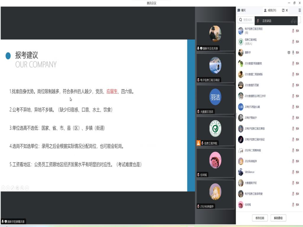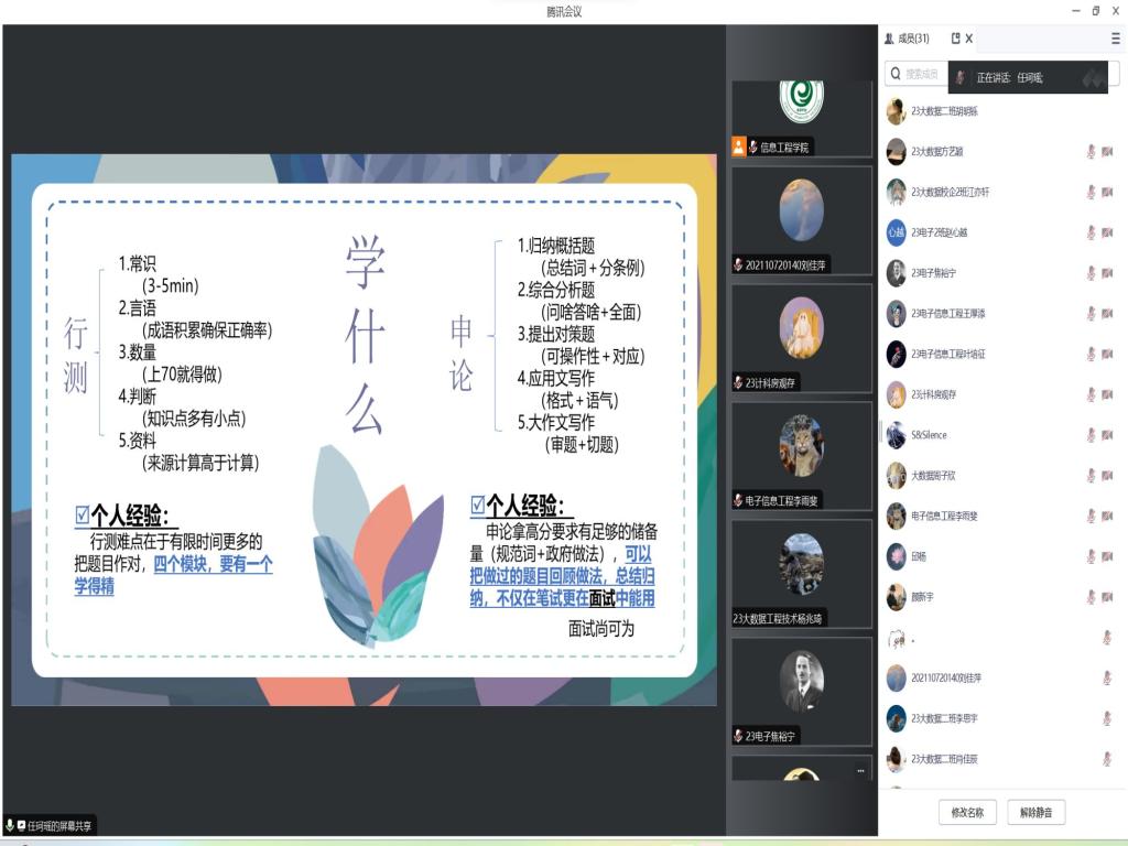 任珂瑶结合公务员备考经历向与会人员分享了自身的准备过程和学习方法,并围绕题目类型、出题特点和答题方法等方面带领大家详细分析了公考笔试内容。她建议,一是要精准自我定位,坚定报考目标。要充分结合自身实际情况和未来规划选职挑岗,要尽快尽早地熟悉政策、收集信息。目标确定后要做到不轻视、不畏难、不动摇。二是要端正备考态度,强化心理建设。要高度珍惜备考时间和考试机会,不断掌握心态调整和心理调节的策略方法,尽可能消除缩小“主观因素”的影响。三是要理清备考思绪,把握复习重点。练习复习要有计划、有目标、有条理,要注意“分层分类”总结归纳知识要点,在勤刷题、常回顾中实现知识的融会贯通和灵活应用。颜新宇重点围绕公务员备考的不同时间阶段分享了经验心得、强调了注意事项。他指出,要关注好公务员报考官方网站、利用好各类学习APP以便及时了解获取最新通知和政策变化。要学会分步科学备考,可以按照“听课、记录、刷题、复盘”的一体化流程来强化备考复习效率,按照“初期制定好复习节奏、中期控制好做题重点、后期掌握好考试节奏”的备考思路来逐步推进。最后他着重阐明了熟悉面试形式、丰富面试技巧的重要性,要持续提升自身逻辑思维能力和语言表达能力。
