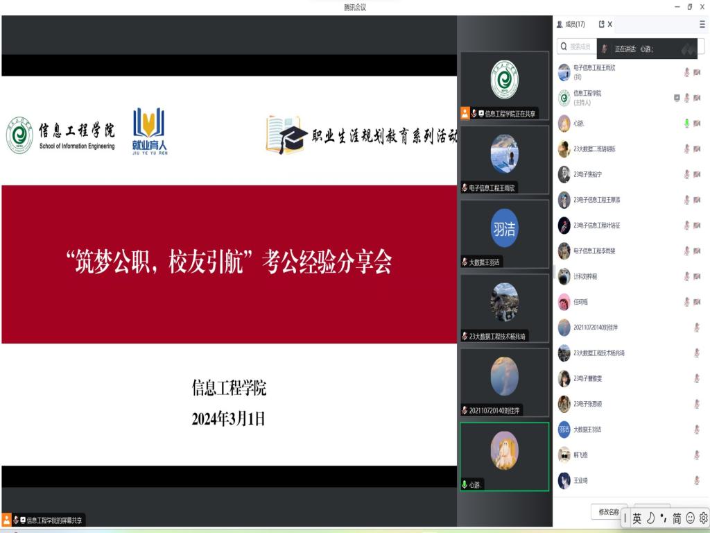 为深入学习贯彻学校第四次党代会精神,强化实施就业优先战略,做实做细大学生就业指导工作,充分发挥朋辈引领作用和校友资源优势,进一步帮助青年学生前置职业规划、转变就业观念、丰富经验储备、打牢就业基础,3月1日,信息工程学院举办2024年大学生职业生涯规划教育活动之考公专题经验分享会。会议邀请学院2022届业毕业生任珂瑶和2023届毕业生颜新宇作为主讲嘉宾。