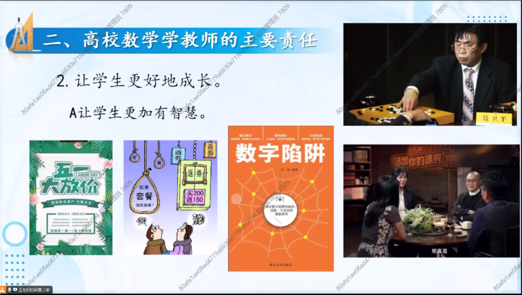 人工智能技术发展迅速,如何在大学数学课程的教学过程中运用人工智能技术,这是当前时期所有教师面临的新问题,需要探索适合的方式助力课程教学。本次论坛也就该问题进行了探讨,数学教师们认为,备课环节人工智能可以帮助教师优化教学内容,推荐相关教学资源帮助教师丰富教学材料;实施环节人工智能可以作为课堂助手,记录课堂数据,回答学生问题,帮助学生理解抽象的数学概念,增加学习的趣味性;评价环节人工智能技术可以助力教师分析学生的学习情况,提供建议。