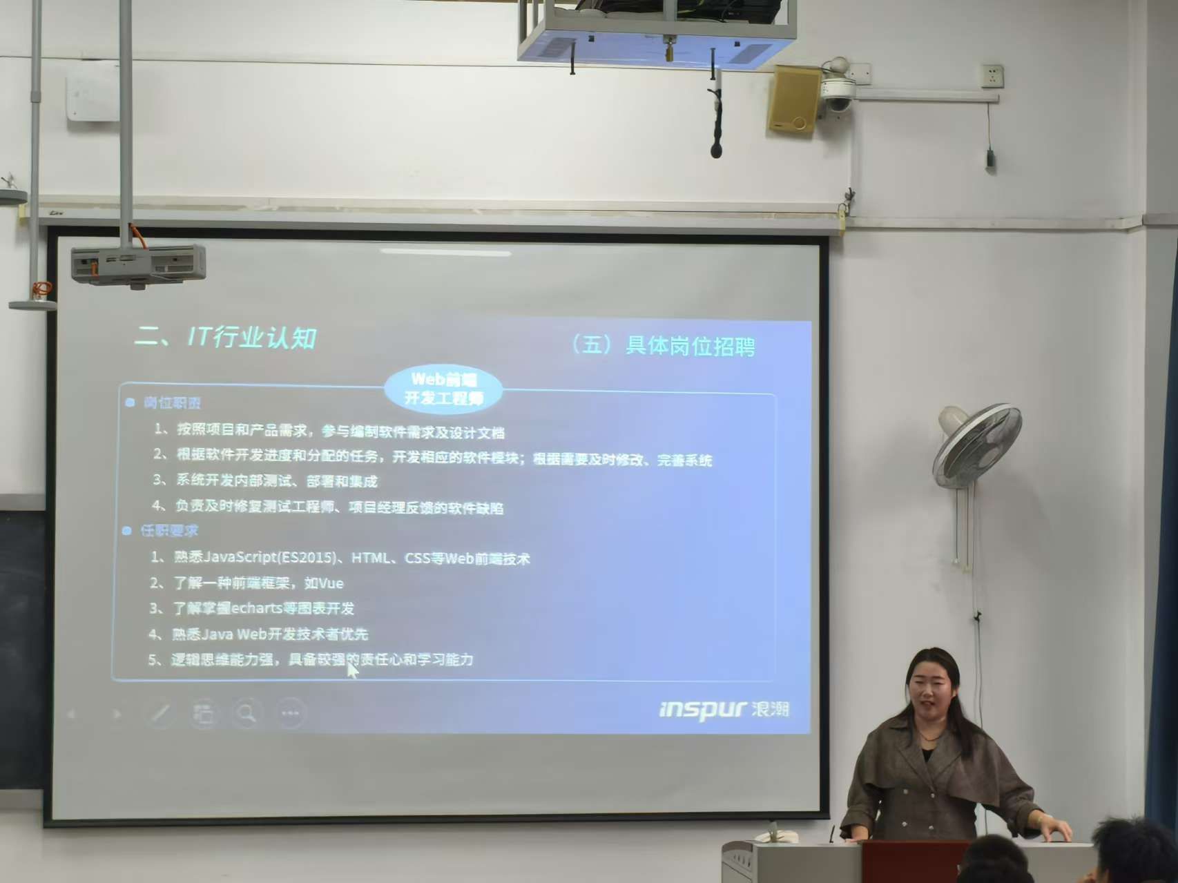 活动最后,贾蓓围绕活动形式、参赛对象、活动要求、进度安排、奖励办法等方面对“浪潮杯”2024年大学生职业规划大赛进行了全面介绍,鼓励参会同学积极报名、踊跃参加比赛,力争以赛促学、以学促行,做到知行合一、学用结合。她同时对部分优质企业和招聘岗位做了推介。