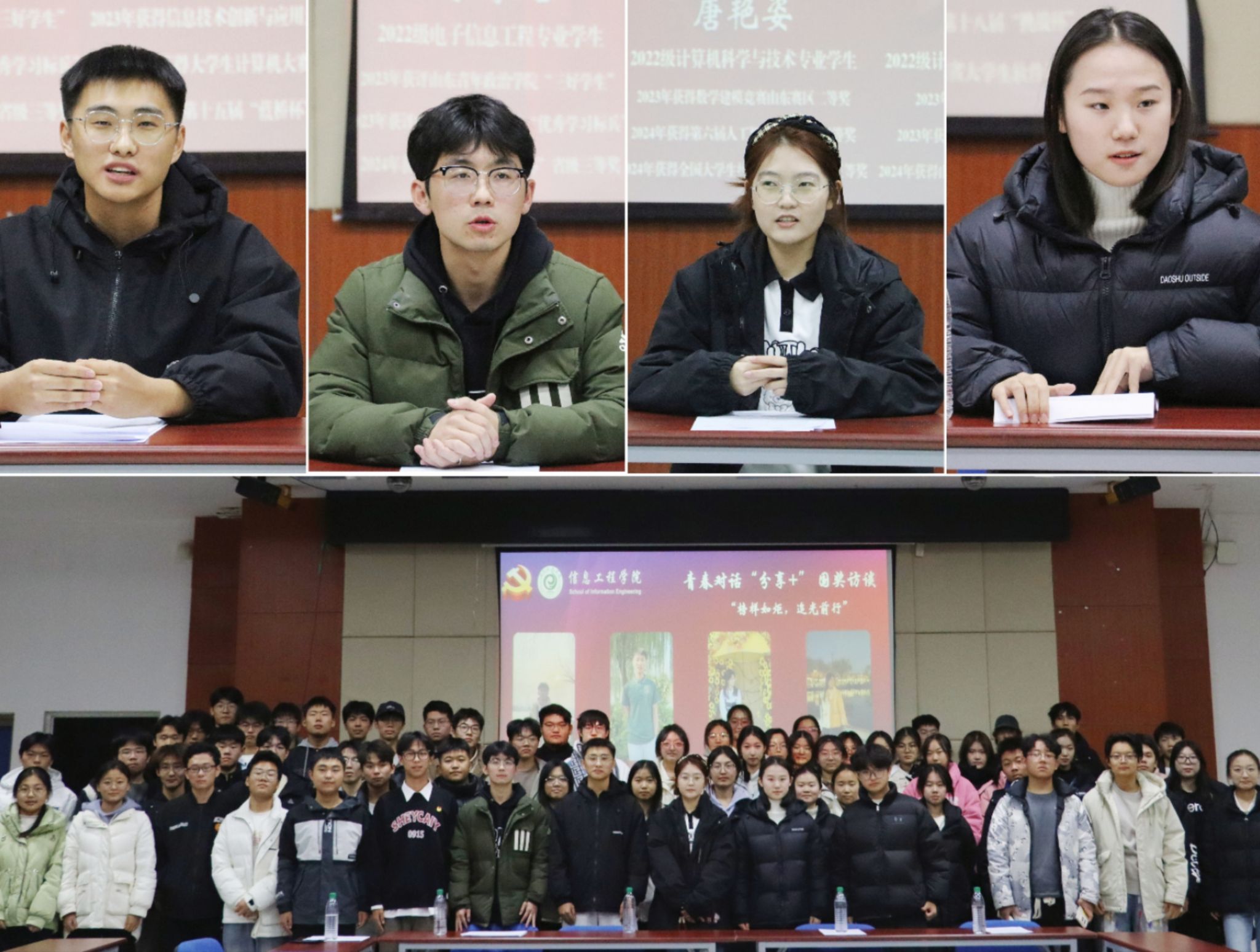为落实学校“三全育人”示范校建设要求,促进优良学风建设, 11月29日,信息工程学院在培训教室举办第二期青春对话“分享+”访谈活动,邀请赵甲栋、李冉、唐艳姿、马腾超等4位国家奖学金获得者进行现场访谈,2023级、2024级部分学生参加活动。
