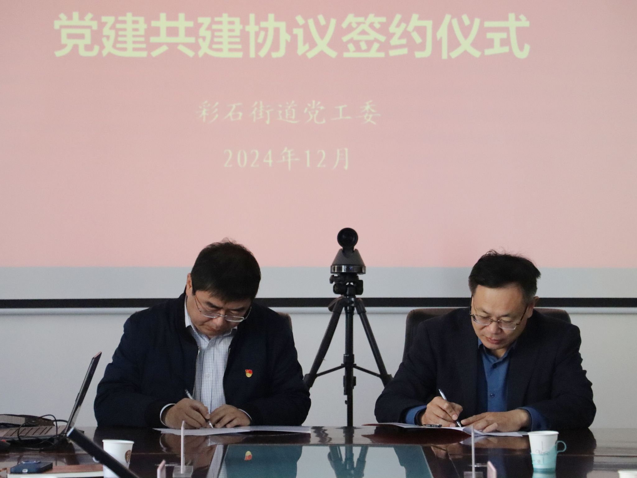 会上,马骋发表致辞,介绍了学校办学历史和学院专业特色,并着重介绍了学院在党建工作体系以及团学工作方面的特色亮点,分享了学院实践团队于寒暑期深入基层,探寻乡村振兴实践道路并为乡村直播带货取得优异成绩的历程。他强调学院将秉持培养高素质人才、服务社会的理念,以校地合作为起点,以学院人才培养高质量发展助力乡村振兴。姜玉龙分享了街道在乡村振兴、校地合作方面的积极探索与成果,展现了彩石街道在推动农业现代化、促进乡村全面振兴方面的决心与成效。同时对学院参与乡村振兴表示感谢,期待未来能够通过校地共建有更多的高校资源联合到基层中,为乡村振兴注入强劲动力。随后,姜玉龙和马骋分别代表双方党委签署党建共建协议书。