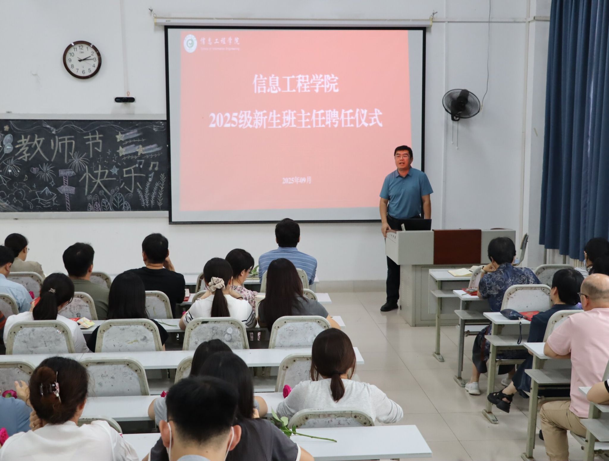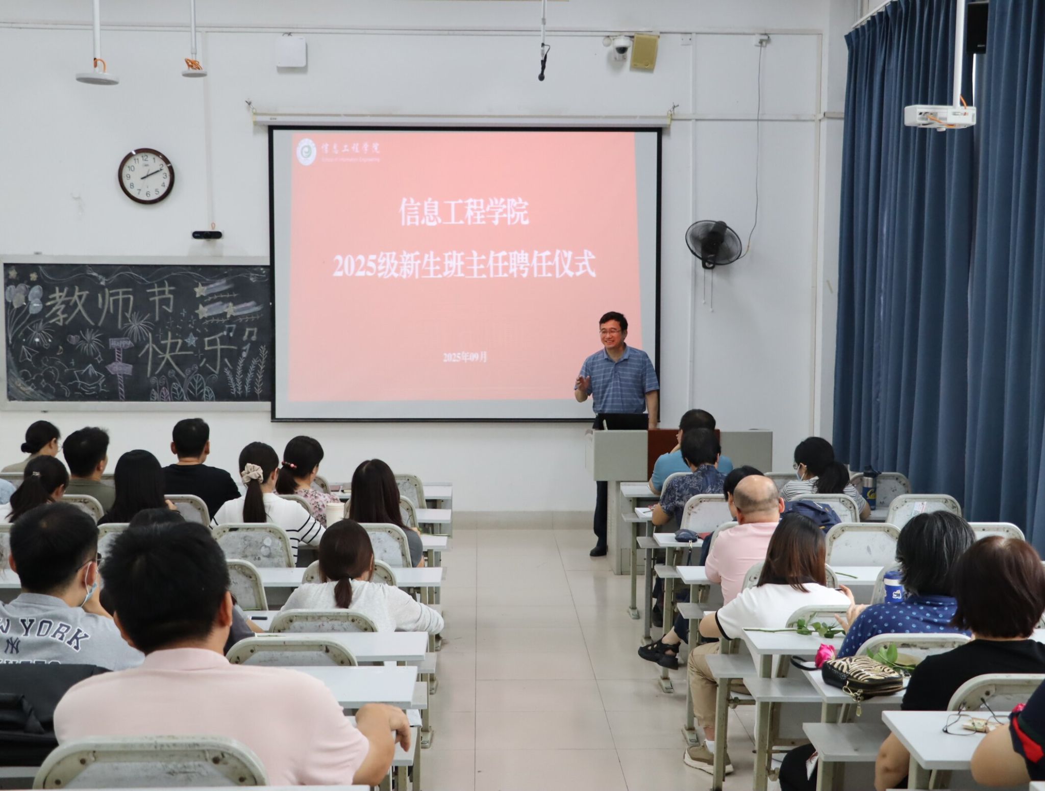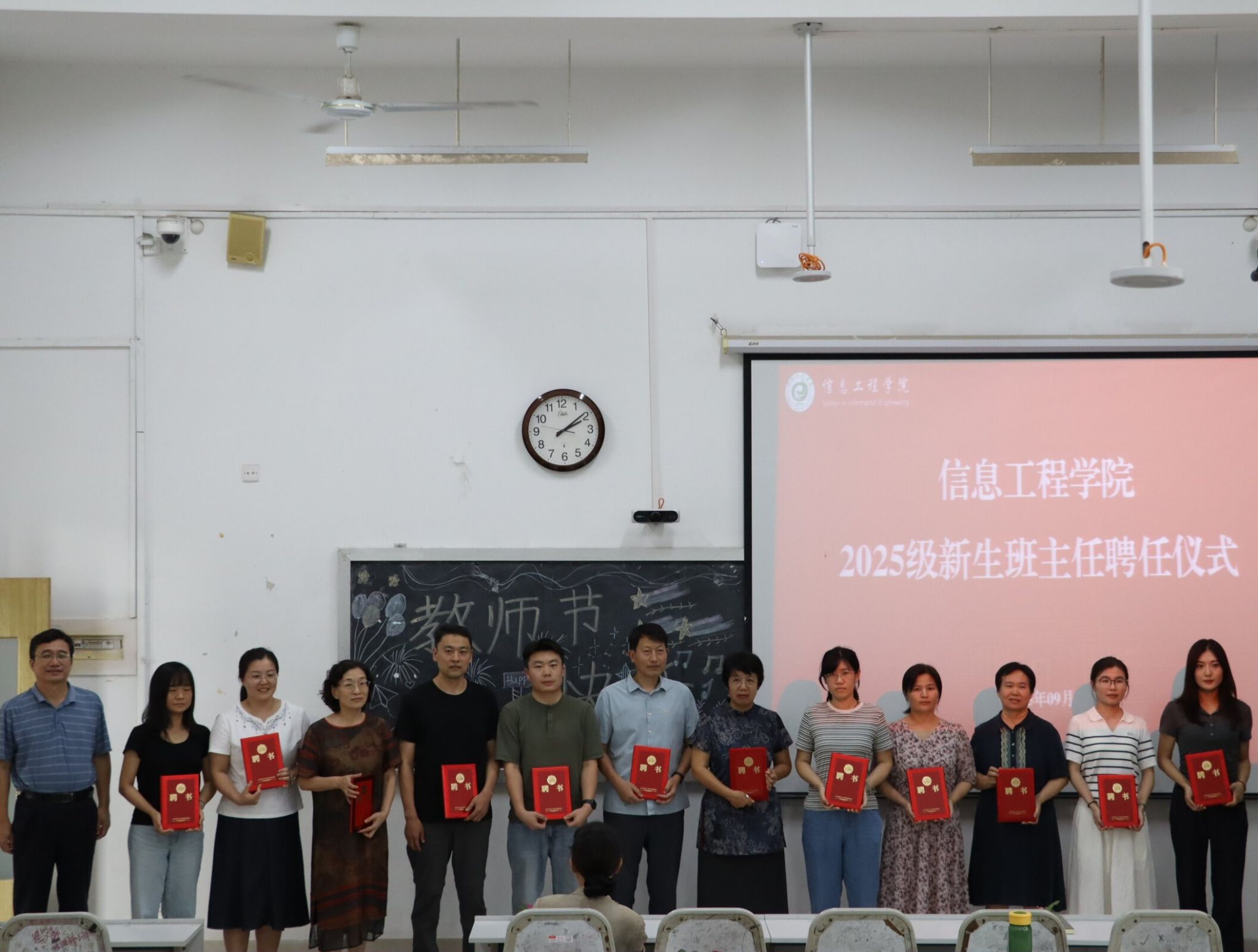 为大力弘扬教育家精神,进一步强化班主任在学生成长成才中的核心引领作用,信息工程学院举办2025级班主任聘任仪式,明确16位政治素质硬、业务能力强、责任心突出的教师担任2025级新生班主任。随后,学院党委副书记、院长宁玉富为新聘班主任颁发聘书。全场热烈掌声与鲜红的聘书交相辉映,既传递了同学们对老师们的节日祝福,也象征着 “责任” 与 “信赖” 的接力 —— 班主任接过的不仅是聘书,更是守护学生成长的重任,以及学生对良师的深切期盼。