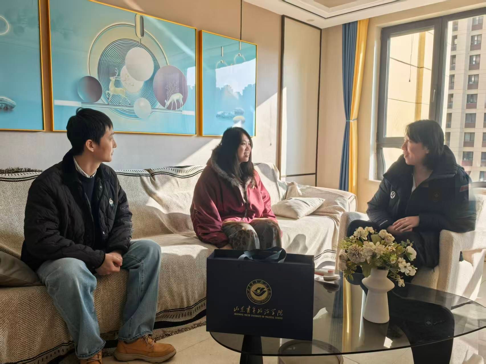 暖心家访助力成长。1月24日,学院党委书记张蕾、党委副书记曲蓉蓉带领辅导员赴淄博桓台、临淄等地,深入经济困难学生家庭进行实地走访。走访中,全面了解了学生家庭情况与成长需求,相关辅导员向家长反馈了学生在校表现,解读各级资助与学业帮扶政策,并针对学生个人情况提供升学就业指导。学院同时成立辅导员、班主任“云访问”帮扶团,利用假期对经济、学业、就业等方面存在困难的学生家庭开展“一对一”线上访谈,实时跟踪学生假期学习状态与心理动态,同步推送学业资源、岗位信息与政策解读,切实做到帮扶不断线、关怀不缺席。