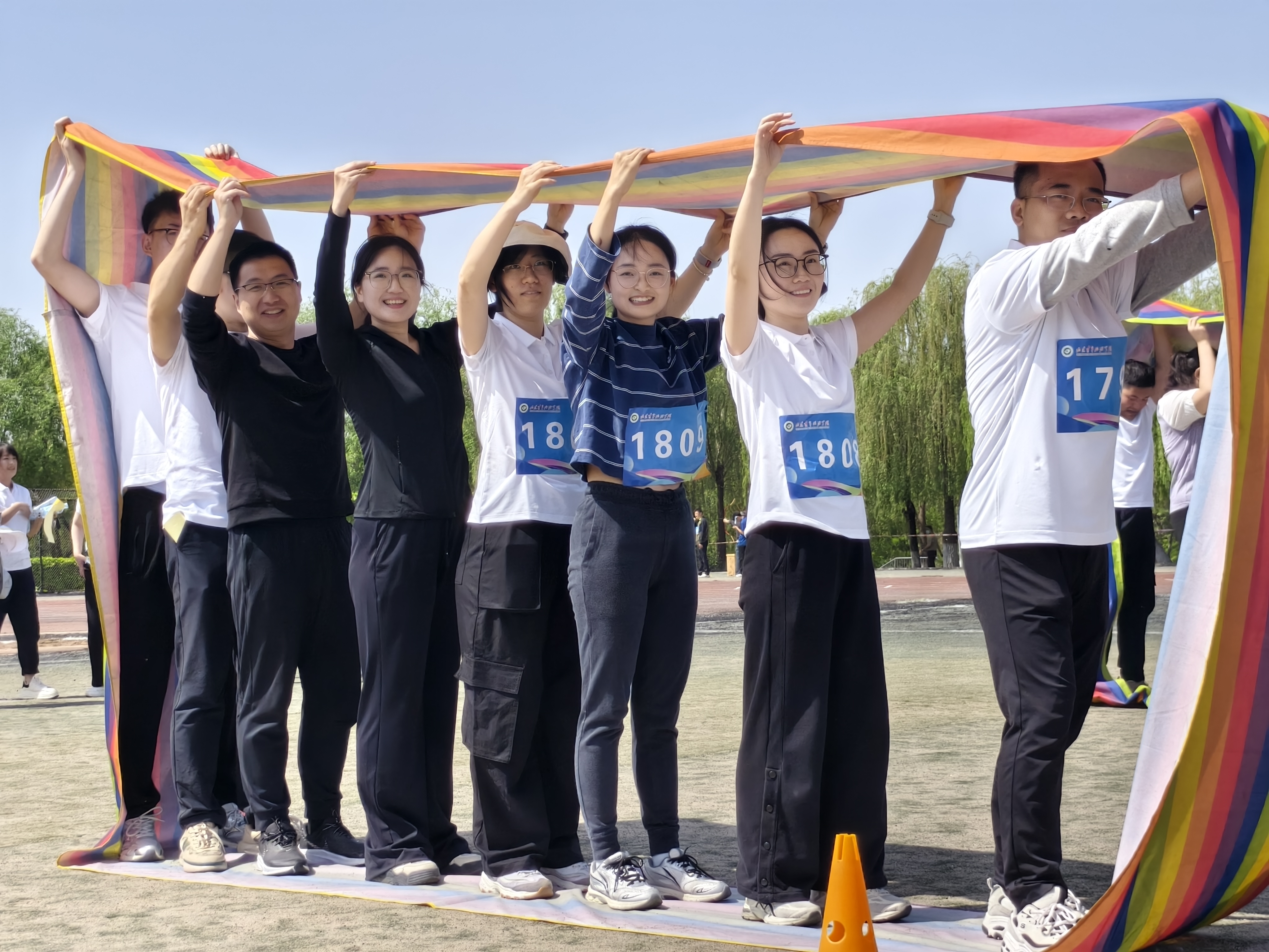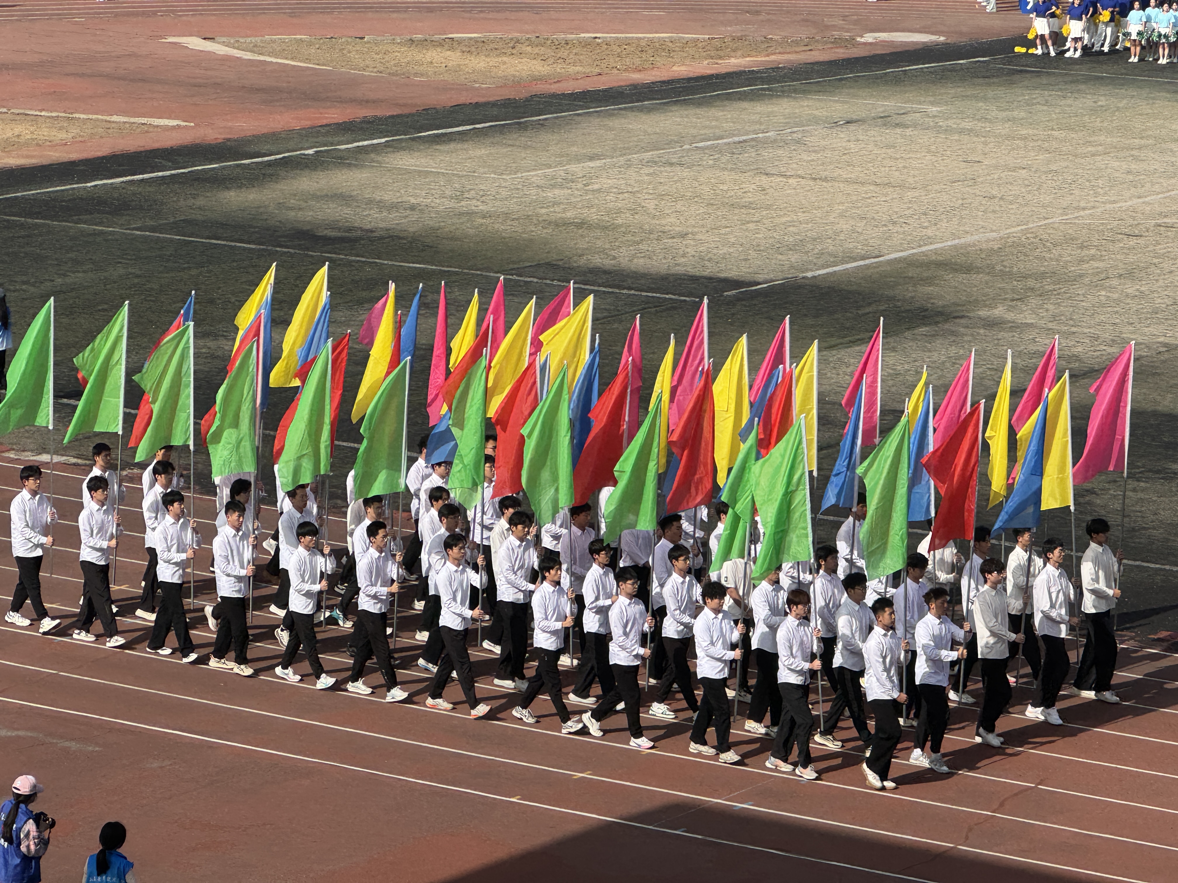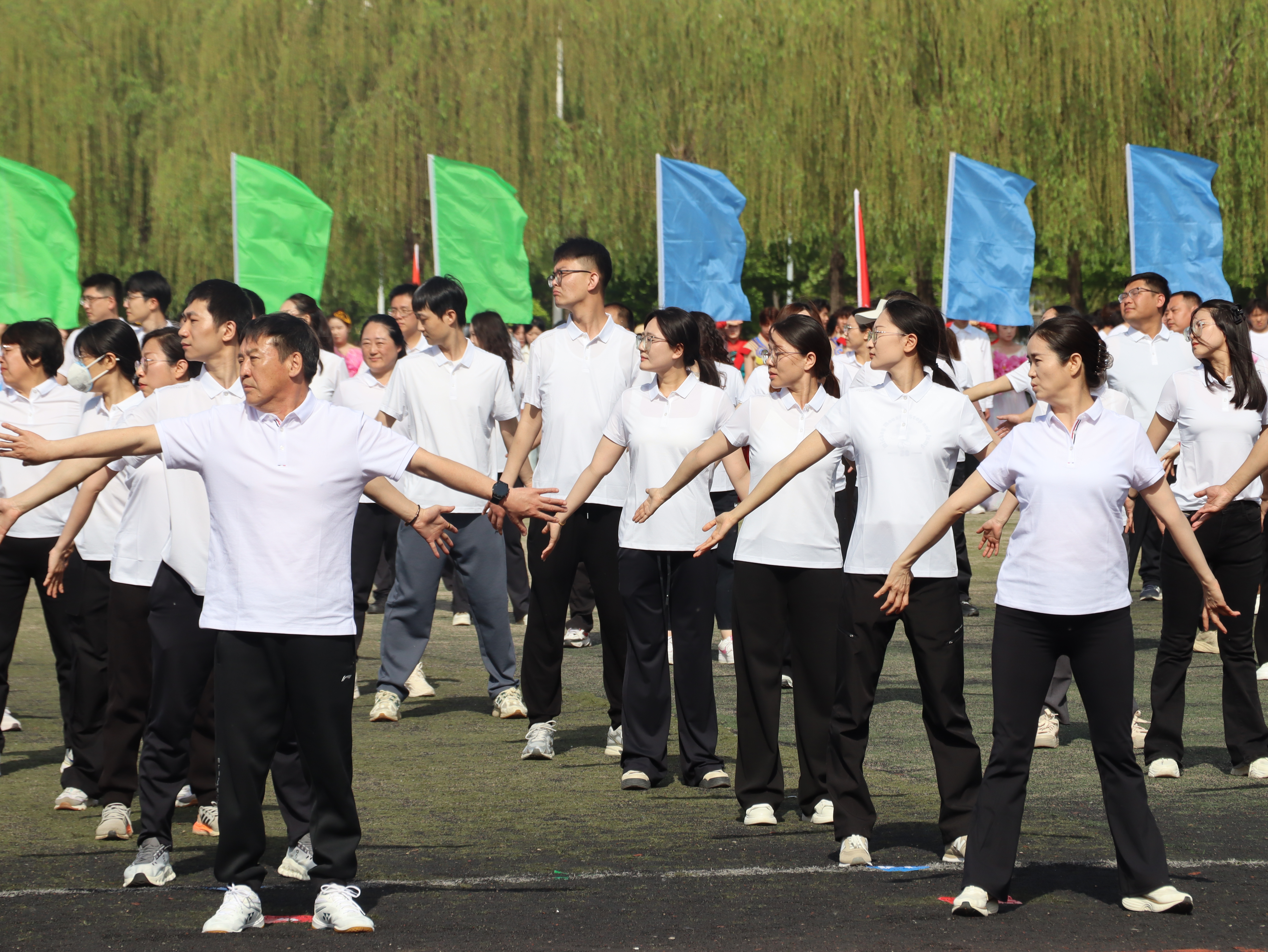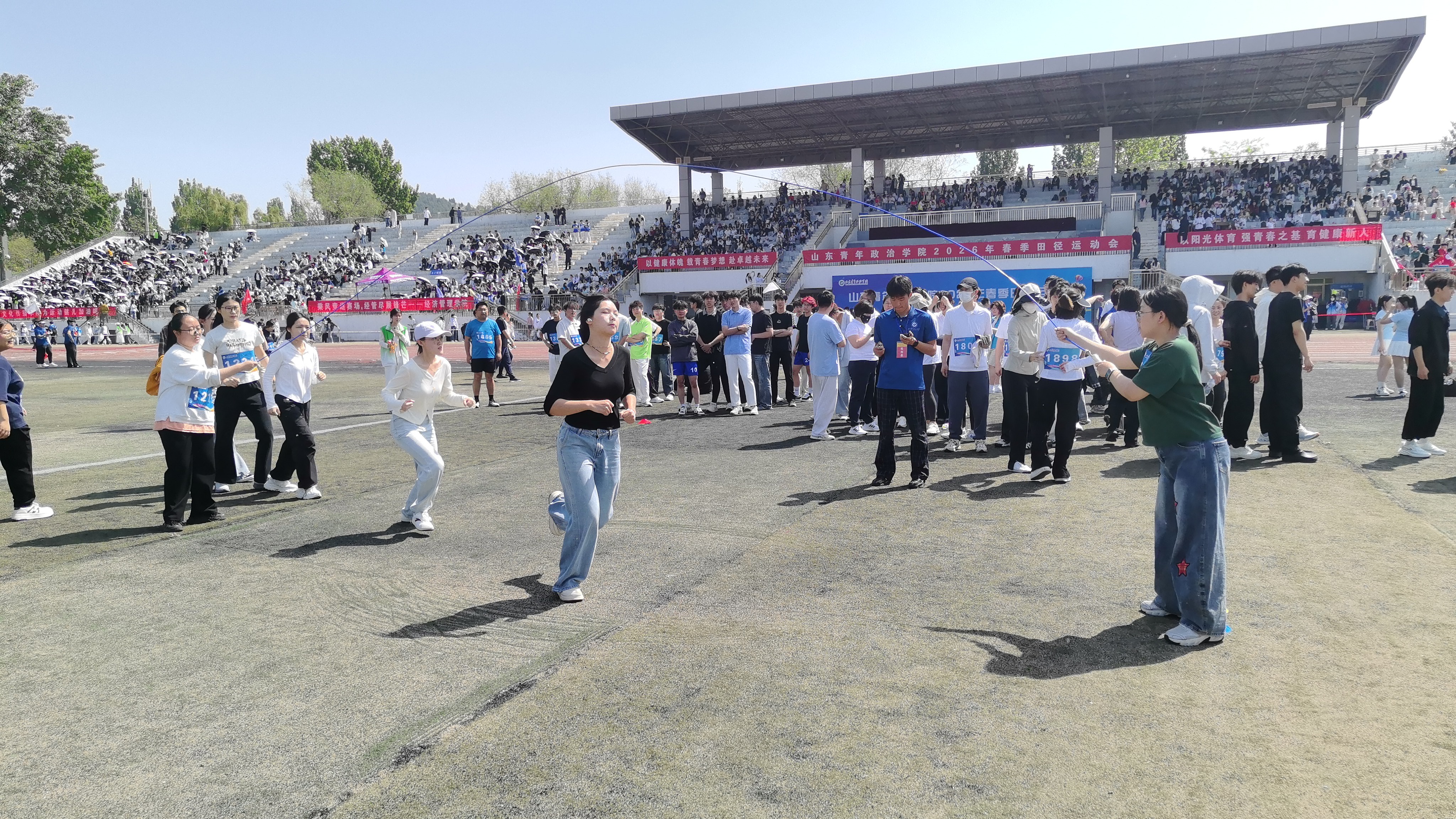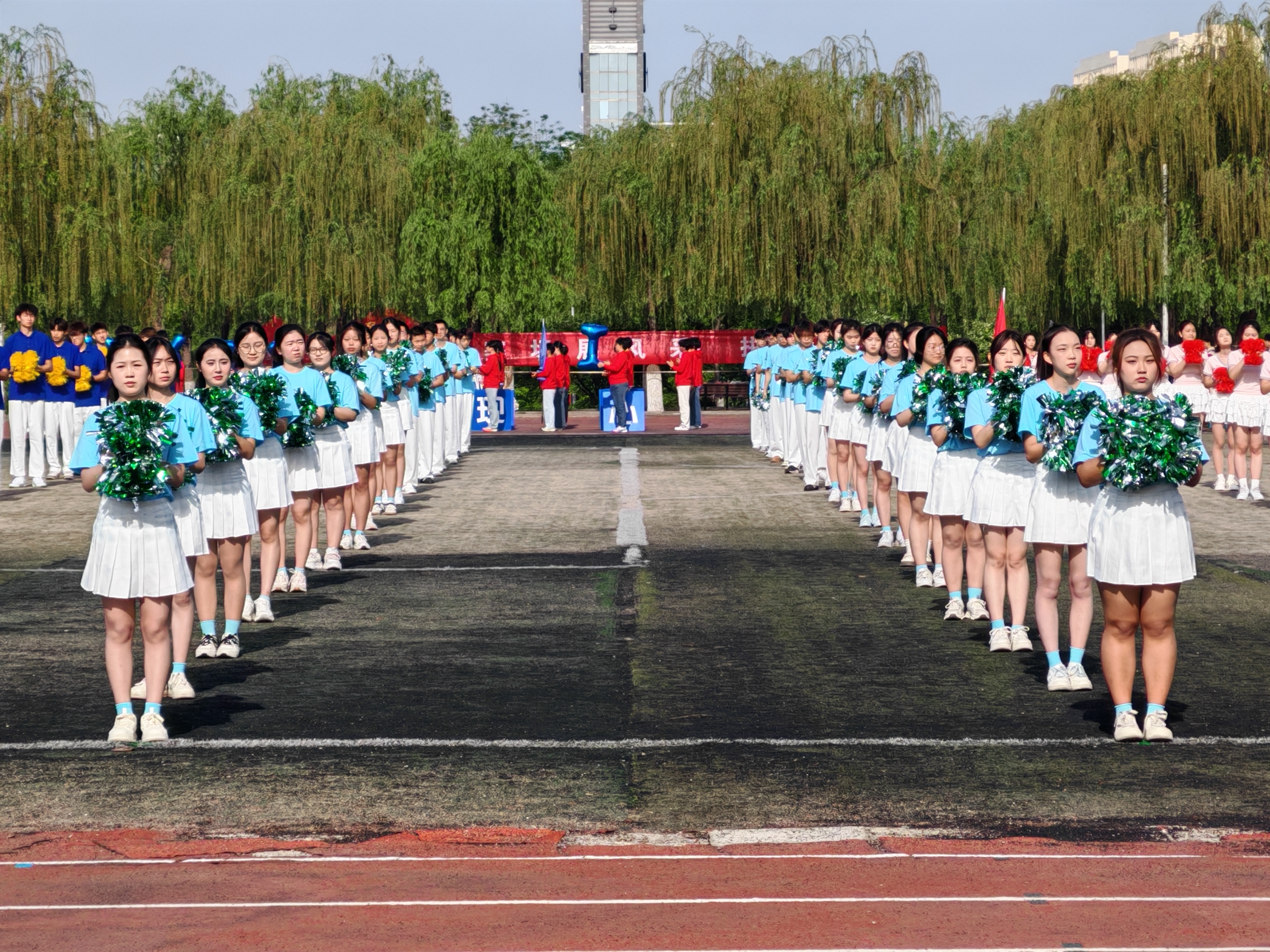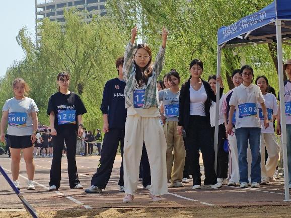 比赛现场,彩旗猎猎,呐喊震天。学院师生团结一心,同场竞技。从百米赛道的奋力冲刺到中长跑的坚韧不拔,从田赛场上的腾空一跃到接力区内的无缝交接,从八段锦展演的刚柔并济到师生拔河的凝心聚力,从跳大绳项目的默契配合到趣味项目的欢声笑语……师生运动员们配合默契、齐心协力,用汗水诠释坚持与耐力,用拼搏定义青春与热血。看台上欢呼声此起彼伏,赛场内外洋溢着浓厚的体育竞技氛围。表演方队步伐矫健、动作整齐划一,以青春活力的编排赢得了主席台与观众席的热烈掌声;团体操方队身着统一服装,伴随动感旋律变换队形,以蓬勃朝气勾勒出校园的灵动风景;彩旗方队成员身姿挺拔,手中的旗帜迎风招展,为绿茵场增添了一抹亮丽的色彩。赛场边,志愿者团队细致周到,主动承担物资补给、秩序维护和后勤保障任务,成为赛事顺利运转的坚实后盾。