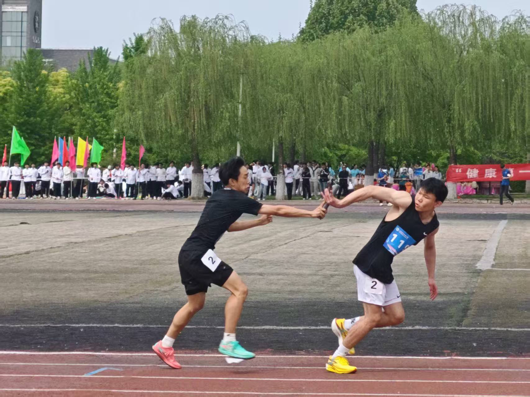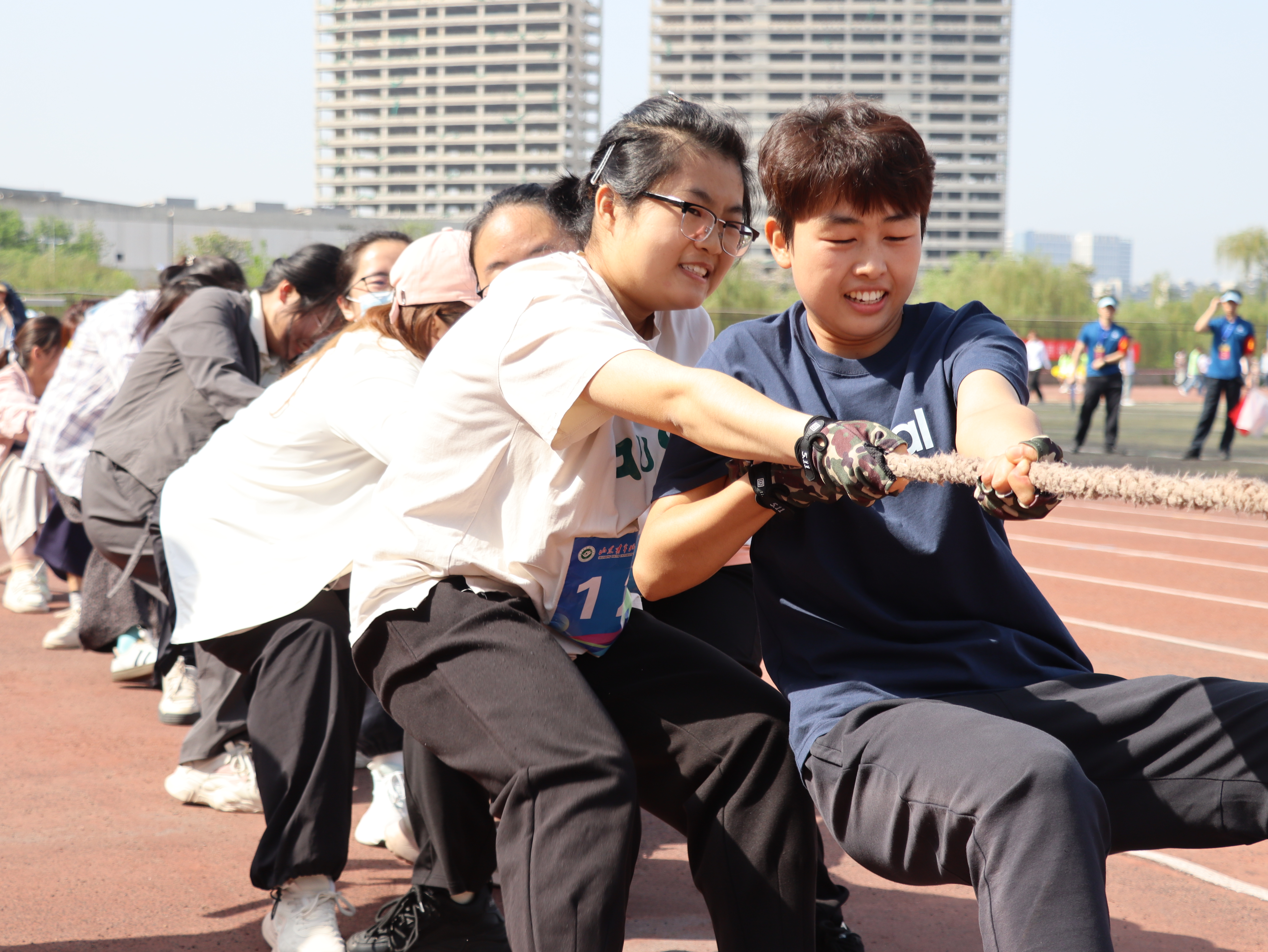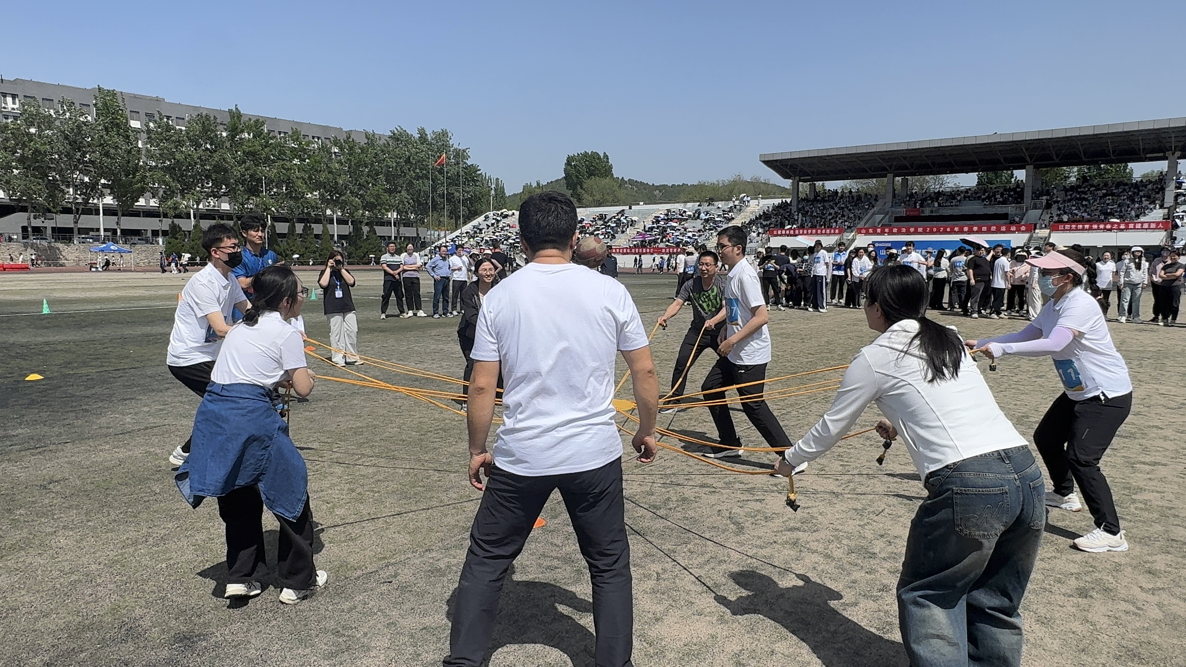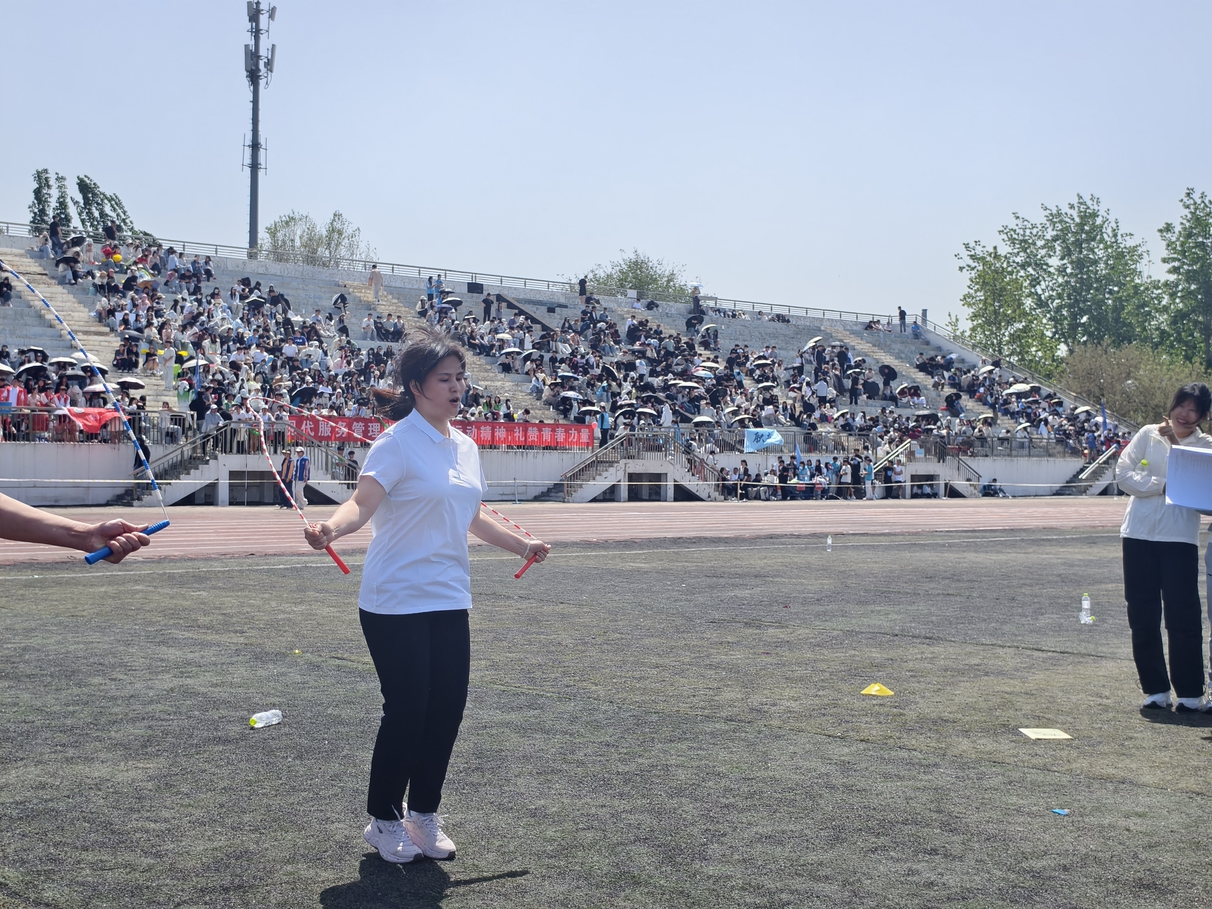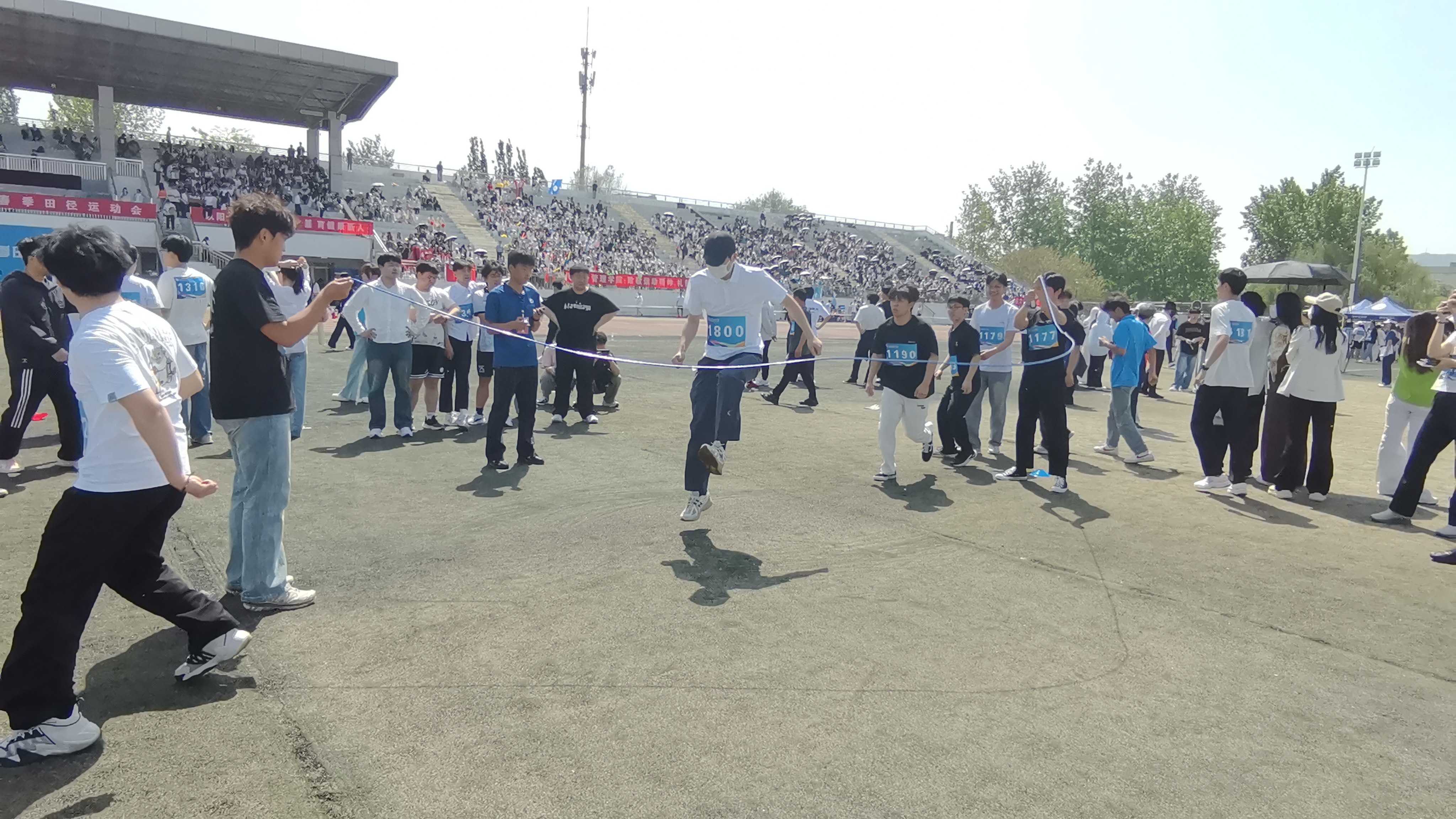 比赛现场,彩旗猎猎,呐喊震天。学院师生团结一心,同场竞技。从百米赛道的奋力冲刺到中长跑的坚韧不拔,从田赛场上的腾空一跃到接力区内的无缝交接,从八段锦展演的刚柔并济到师生拔河的凝心聚力,从跳大绳项目的默契配合到趣味项目的欢声笑语……师生运动员们配合默契、齐心协力,用汗水诠释坚持与耐力,用拼搏定义青春与热血。看台上欢呼声此起彼伏,赛场内外洋溢着浓厚的体育竞技氛围。表演方队步伐矫健、动作整齐划一,以青春活力的编排赢得了主席台与观众席的热烈掌声;团体操方队身着统一服装,伴随动感旋律变换队形,以蓬勃朝气勾勒出校园的灵动风景;彩旗方队成员身姿挺拔,手中的旗帜迎风招展,为绿茵场增添了一抹亮丽的色彩。赛场边,志愿者团队细致周到,主动承担物资补给、秩序维护和后勤保障任务,成为赛事顺利运转的坚实后盾。