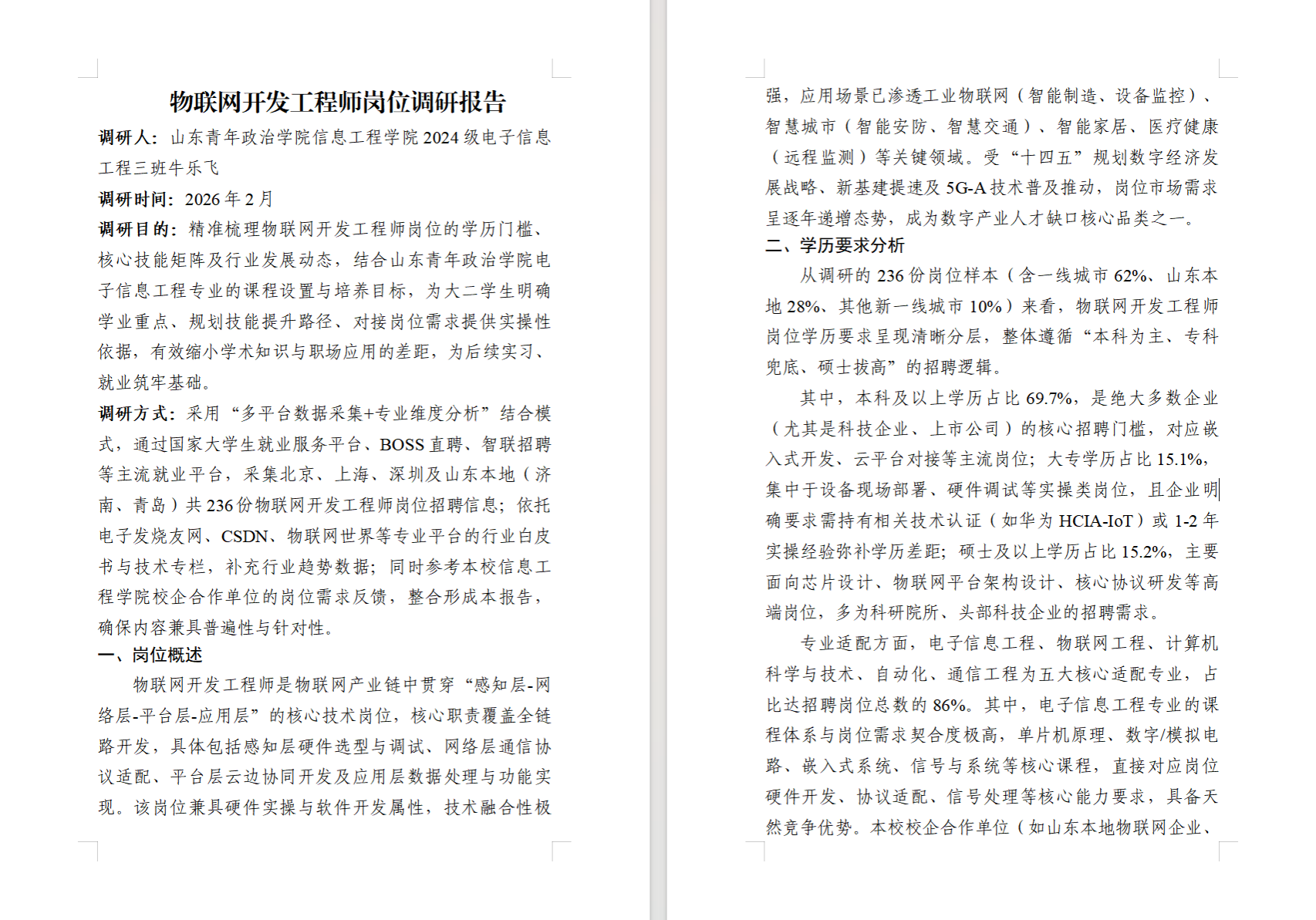活动开展以来,学院各专业学生围绕物联网开发工程等核心岗位开展深度调研,系统梳理了行业发展趋势、学历门槛与核心技能要求,形成的调研报告不仅是清晰的岗位说明书,更是同学们专业成长的路线图,为全院学生提供了可借鉴的职业规划参考。