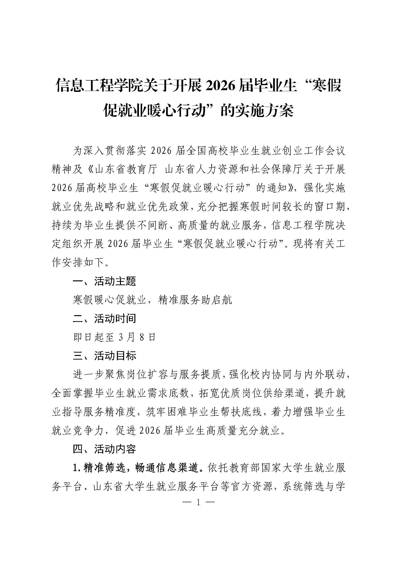 为深入贯彻党中央、国务院关于高校毕业生就业工作的决策部署,强化实施就业优先战略和就业育人导向,按照《山东省教育厅 山东省人力资源和社会保障厅关于开展2026届高校毕业生“寒假促就业暖心行动”的通知》要求,寒假期间,信息工程学院多措并举开展“寒假促就业暖心行动”。