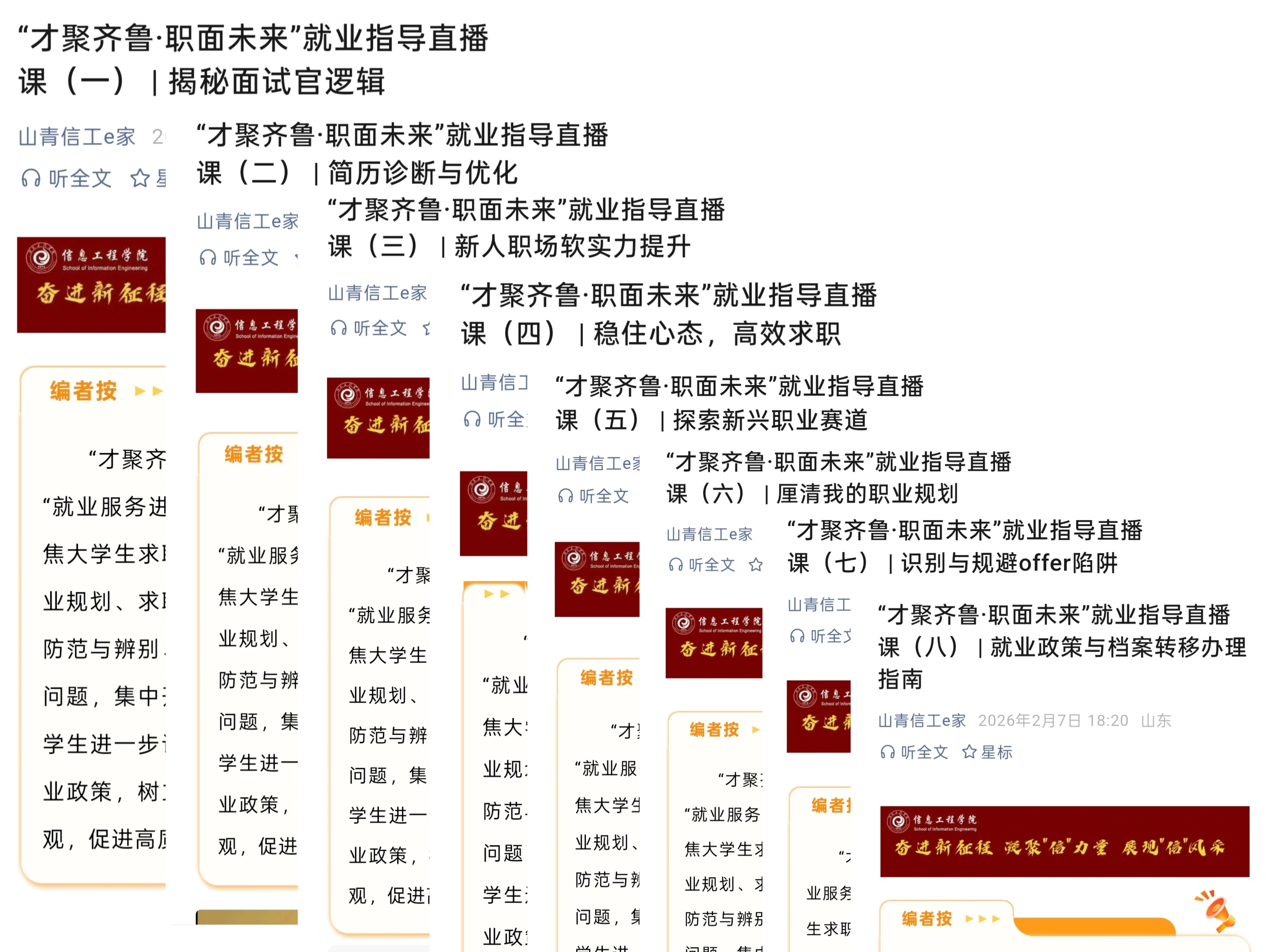 学院坚持精准链接、高效服务,依托教育部、山东省大学生就业服务平台等官方就业资源,系统筛选出与各专业匹配度高、发展前景好的优质岗位。通过学院官方微信公众号精心打造“就业‘职’南针”线上专栏,联动各班级群组同步转发,实现了招聘信息对全体毕业生的精准覆盖与高效传达。同时整合“才聚齐鲁·职面未来”系列直播课程,围绕简历、面试、政策等内容,面向全体毕业生系统推送8期“云课堂”,持续做优“云指导”,不断强化学生求职竞争力,切实提升岗位匹配精度与就业服务温度。