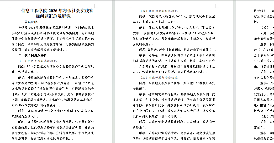 为确保社会实践高标准开局、高质量推进,学院在寒假前构建“全方位筹备+专业化指导”的前置保障体系。依托“思政+专业”双导师制度,组建由辅导员与专业教师组成的指导团队,围绕10大实践主线开展选题,帮助团队精准对接基层需求与专业特色;建立团队动态管理机制,明确材料报送节点与安全责任要求,通过线上答疑群实时解决实践筹备中的各类问题。多维度的筹备工作充分激发了学子的实践热情,确保每支团队都能带着目标出发、带着思考实践。