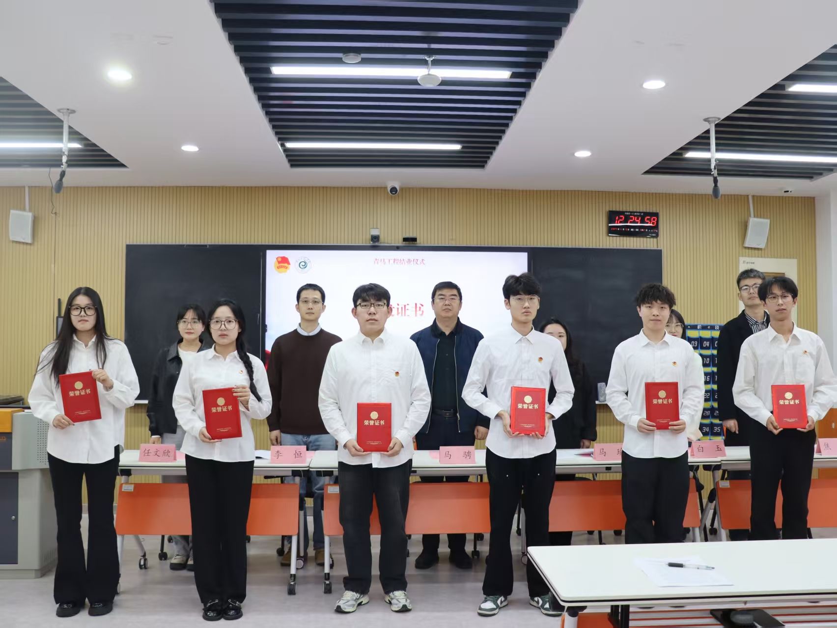 在庄严的国歌声中,仪式正式拉开帷幕。辅导员李恒宣读了《关于准予2024-2025学年“青马工程”培训班学员结业和表彰优秀学员的决定》,对上一学年学员的学习成果予以充分肯定。与会领导老师为优秀学员代表颁发荣誉证书,肯定他们在理论学习、实践锻炼等方面的突出表现。优秀学员代表在发言中回顾了在青马班的学习历程,表示将始终坚守理想信念,把培训所学转化为前进动力,努力成长为有信仰、有担当的青年政治骨干。