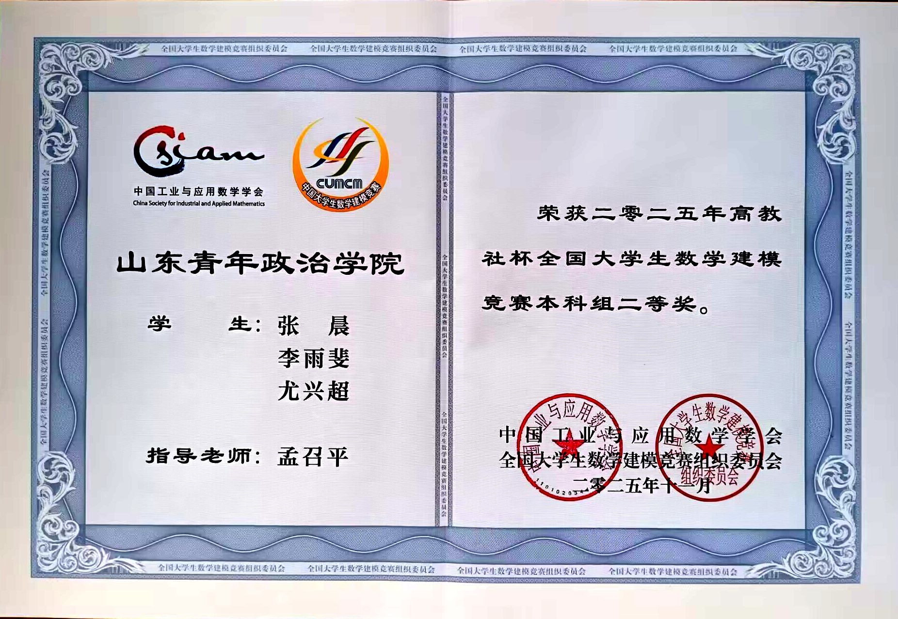 在全国大学生数学建模竞赛中,学校荣获国家二等奖1项,省级一等奖2项、省级二等奖3项。由孟召平老师指导的张晨团队,面对复杂的实际问题,快速构建数学模型,通过严谨的推理和科学的求解,最终在众多参赛队伍中崭露头角,荣获国家二等奖,展现了学院学子出色的逻辑思维与问题解决能力。