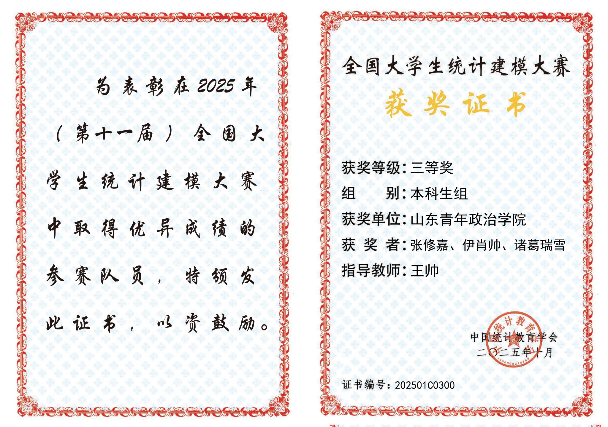 在全国大学生统计建模大赛中,学校荣获国家级二等奖、三等奖各1项,省级一等奖6项、省级二等奖7项、省级三等奖11项,奖项数量与质量均在同类院校中名列前茅。其中,由王丽慧老师指导的曹雅雯团队,凭借对竞赛问题的深度剖析、严谨论证及精准建模,荣获国家级二等奖;王帅老师指导的张修嘉团队,则依托扎实的统计分析功底与娴熟的机器学习技术,摘得国家级三等奖。